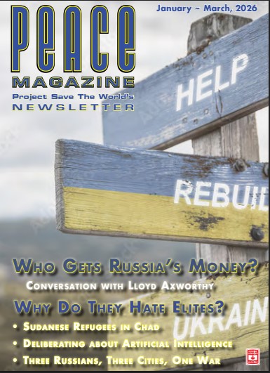 In the past, our 32-page magazine was available in two forms: a quarterly print publication, and the text archive on our website, www.peacemagazine.org. The former costs $20 a year in Canada. Foreign subscribers have been few, since it is costly and slow to mail print magazines overseas.